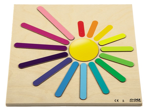 Un puzzle original (24,5×24,5 cm) qui permet de découvrir à la fois les tailles, les longueurs, l’harmonie des couleurs et les formes de ce joli arc en ciel.