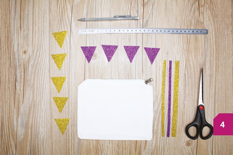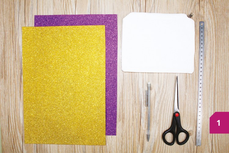 Etape 1 : Préparer tout le matériel : 2 coupons de mousse EVA adhésive pailletée au coloris différent, une trousse à maquillage à customiser, un crayon, une paire de ciseaux et une règle.