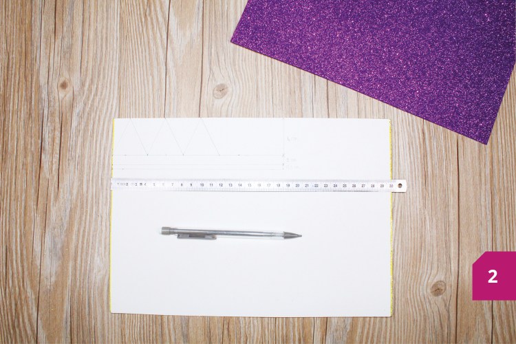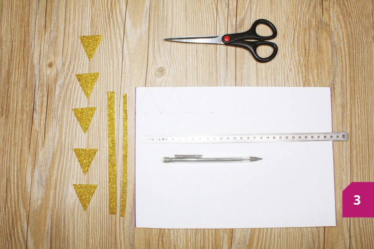 Etape 2 : Sur le premier coupon, dessiner : 5 triangles de 3 cm de largeur et de hauteur, 1 bande d’1 cm de largeur et de 18,5 cm de longueur, 1 bande de 0,5 cm de largeur et de 18,5 cm de longueur, puis découper.