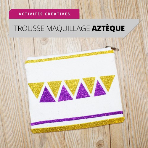 Etape 4 : Après avoir découpé tous les éléments, les placer sur la trousse à maquillage de façon à reproduire une frise aux aspirations aztèques. Une fois les éléments correctement positionnés, les coller en décollant la pellicule au dos de la mousse caoutchouc.