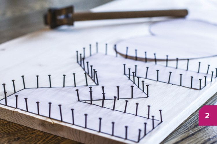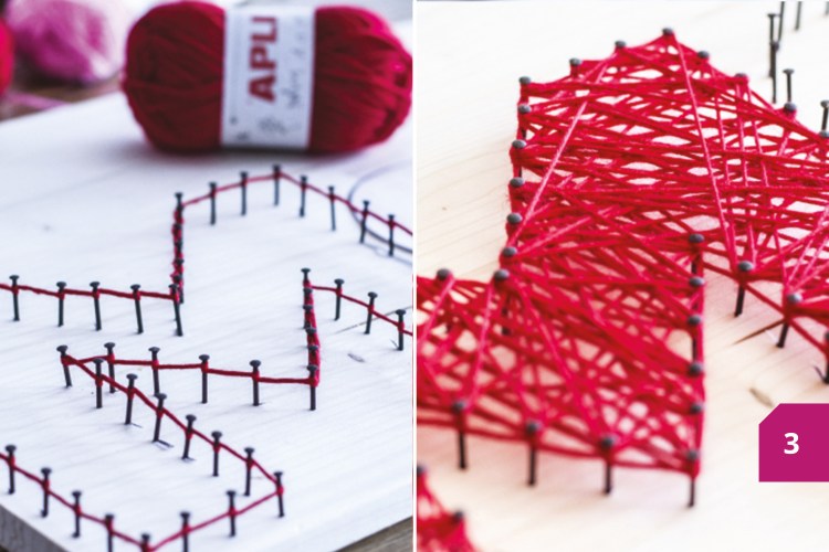 Etape 2 : Fixer les clous avec précaution. Il faut qu’ils soient le plus droits possible, à équidistance les uns des autres. Cette étape étant assez minutieuse, elle peut prendre un certain temps. Un conseil : quand vous fixez les clous sur le cœur, commencez par le centre ; vous obtiendrez ensuite une forme plus symétrique.