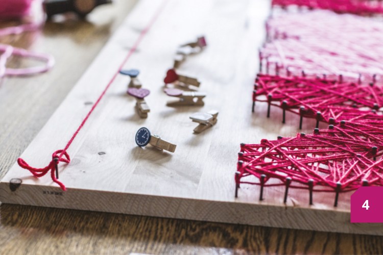 Etape 3 : Une fois tous les clous fixés, placer une extrémité de la pelote de laine colorée sur l’un des clous et l’attacher en faisant un petit nœud, de préférence sur un clou placé dans un coin. Commencer alors à enrouler la laine autour de la lettre. Délimiter le contour pour commencer, puis enrouler la laine entre les différents clous en essayant de ne pas laisser d’espaces vides. Enrouler la laine de manière aléatoire, sans laisser d’espaces vides.