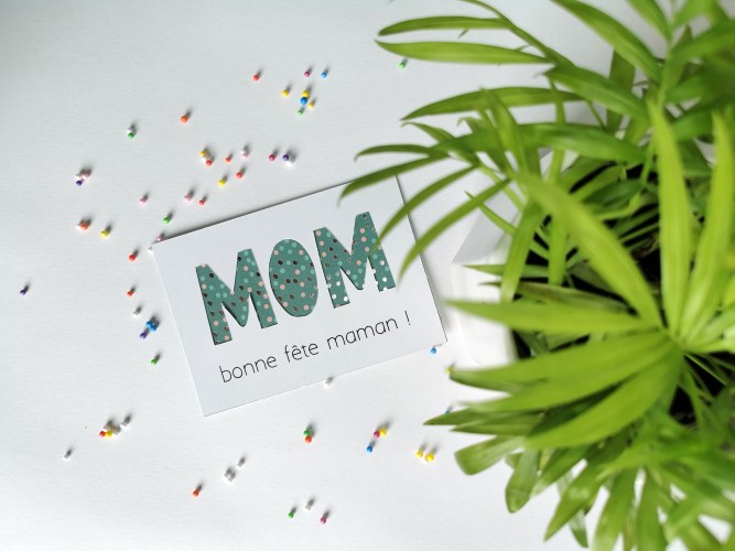 Découper les lettres « MOM ». Couper le papier à motifs au même format que la petite carte.
