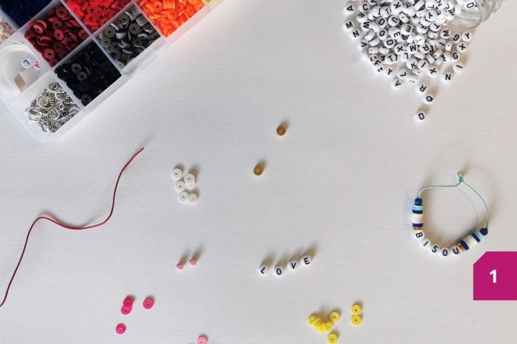 Etape 1 : Choisir les couleurs de perles Heishi ainsi que le mot à écrire. Couper un morceau de fil élastique de 25 cm environ.