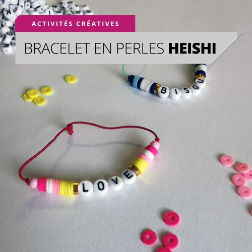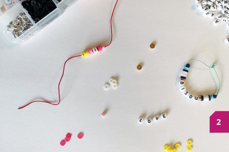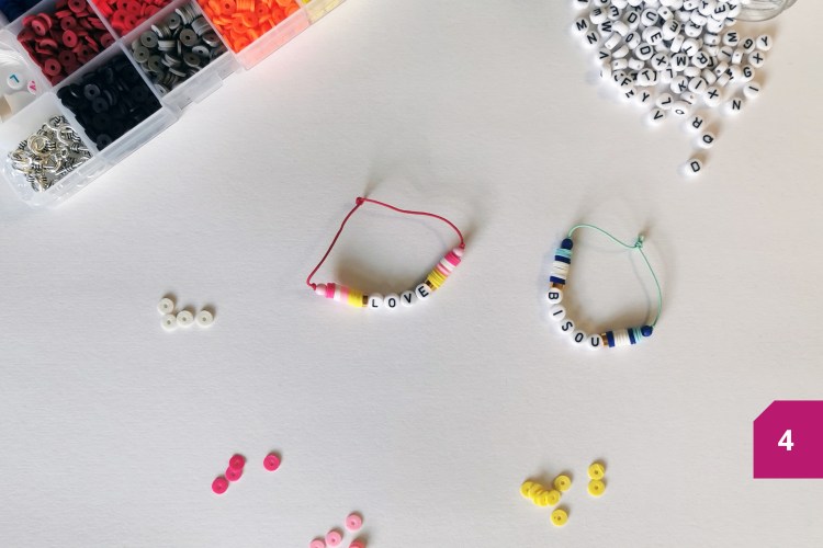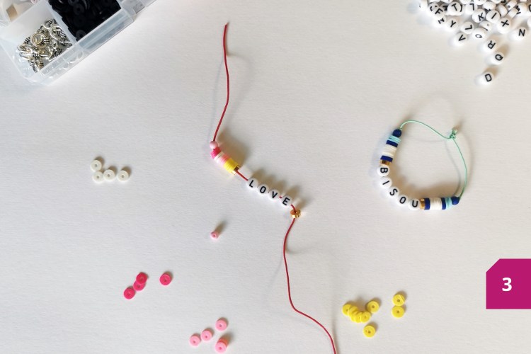 Etape 3 : Insérer les lettres dans l’ordre et dans le bon sens de lecture. Enfiler ensuite les perles Heishi puis la perle ronde de manière symétrique par rapport au début du bracelet.
