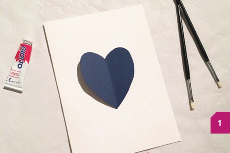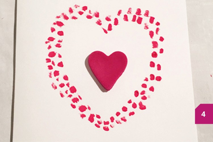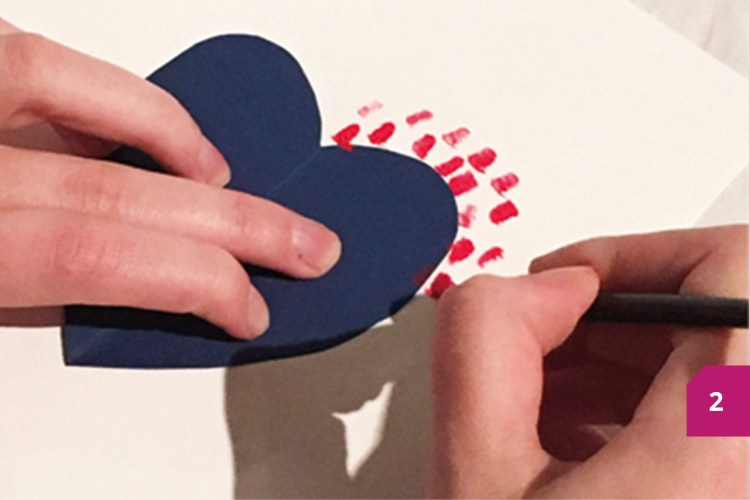 Etape 2 : Plier la feuille colorée en deux, tracer la moitié d’un cœur et la découper. Appliquer la peinture autour de la feuille colorée en faisant des petits points.