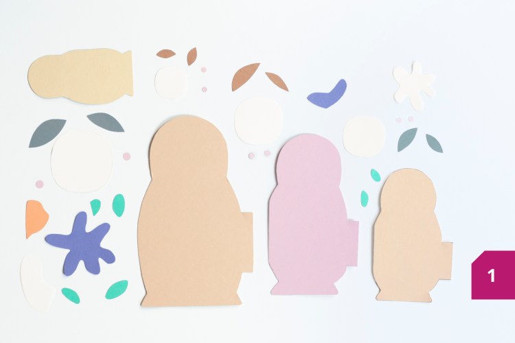 Etape 1 : Télécharger et imprimer le gabarit. Reporter les éléments sur les papiers colorés et les découper. Plier les trois onglets de collage comme suit : Matriochka A vers l’arrière, Matriochka B vers l’avant, Matriochka C vers l’arrière.
