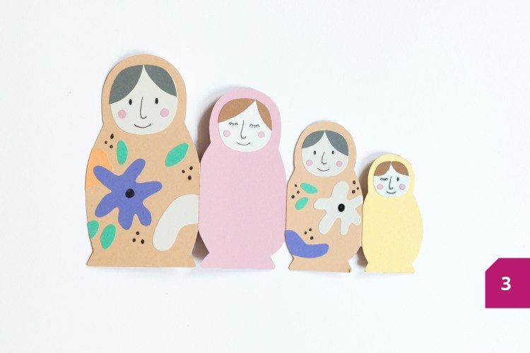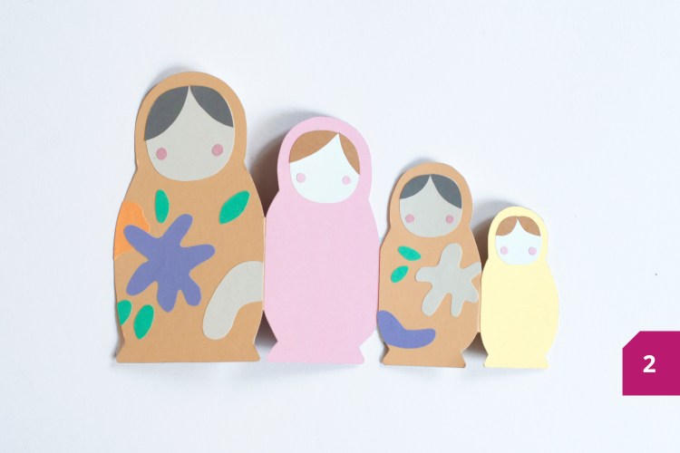 Etape 2 : Coller les quatre Matriochkas ensemble de la plus grande à la plus petite. Coller les différents éléments décoratifs et les visages sur les poupées.