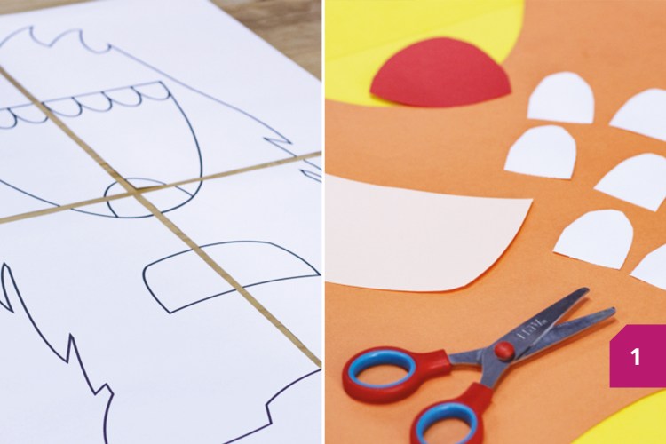 Etape 1 : Télécharger et imprimer les modèles, un par monstre. Les imprimer sur des feuilles A3. Chaque modèle est composé de 4 feuilles. Découper les différentes parties du modèle : tout le bord du monstre et ses dents, sa langue, son ventre et l’orifice de la bouche. Maintenant, les reproduire sur un carton, de la couleur souhaitée.