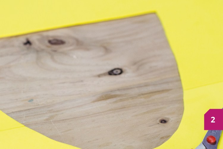 Etape 2 : Assembler deux morceaux de mousse caoutchouc (ici jaune) avec du ruban de peintre, pour faire le fond sur lequel le monstre sera collé. Placer le monstre orange dessus, dessiner l’orifice de la bouche, et couper la mousse caoutchouc, pour obtenir ce qui est montré sur l’image.