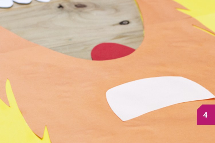Etape 4 : Coller dessus le monstre orange en utilisant aussi la colle, en faisant attention à ce que les orifices de la bouche coïncident. Coller le ventre sur le monstre. La dernière étape consiste à agrafer la mousse caoutchouc jaune aux lattes en bois.