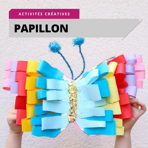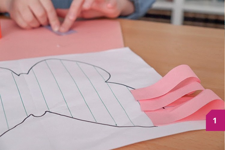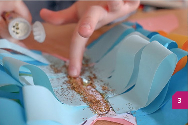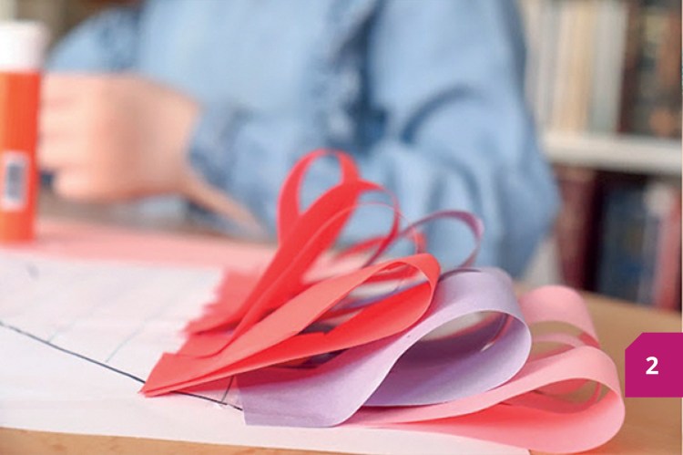 Etape 2 : Découper plusieurs bandes de papier coloré. Confectionner les ailes en fixant les deux extrémités de chaque bande avec un point de colle.