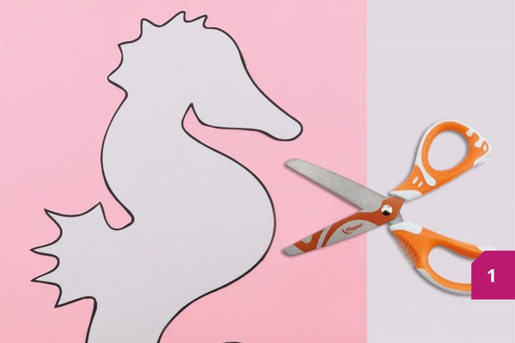 Etape 1 : Télécharger et imprimer le gabarit hippocampe sur notre site internet, rubrique «Espace Idées». Découper le contour en prenant soin de garder le contour noir. Coller la forme sur un papier de couleur. Repasser le contour au feutre noir.