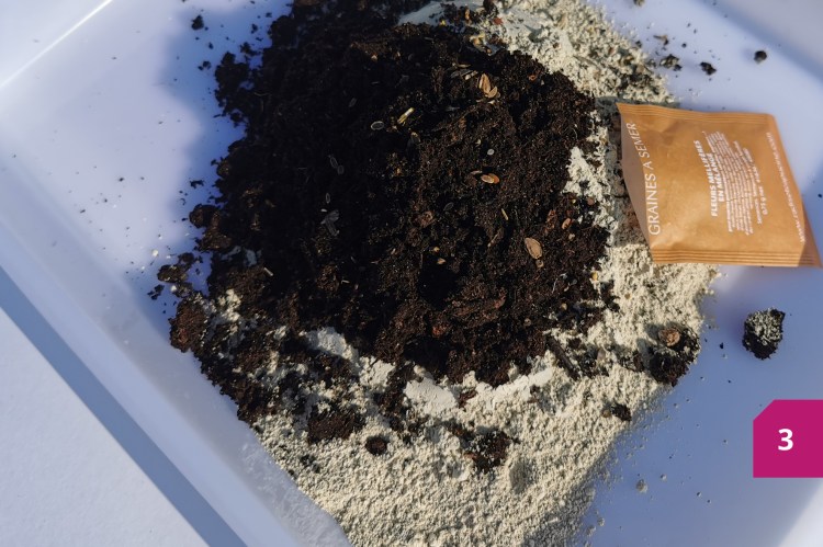 Etape 3 : Ajouter deux sachets de graines de fleurs. L’idéal est de choisir des fleurs mellifères c’est-à-dire qui attirent les abeilles et insectes butineurs parce que ses fleurs contiennent du nectar.