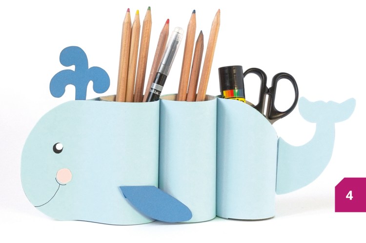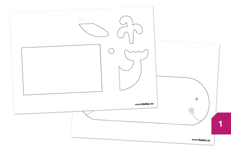 Etape 4 : Fixer maintenant les ailerons au corps. Dessiner un visage sur la baleine avec le feutre noir et coller les joues roses.