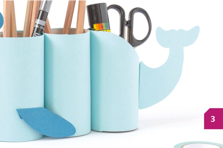 Etape 3 : Recouvrir également les autres rouleaux de papier. Il est possible de couper le dernier rouleau de papier toilette en angle pour créer une forme arrondie. Coller les trois rouleaux ensemble avec du ruban adhésif double-face.
