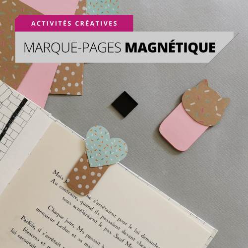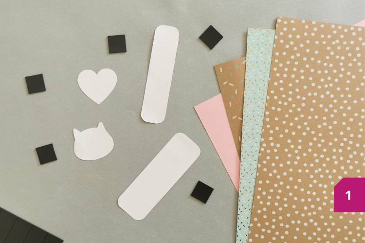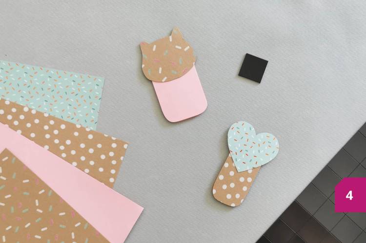 Etape 4 : Grâce aux pastilles de colle, fixer les formes de cœur ou de chat sur le haut des languettes. Le marque-pages est prêt !