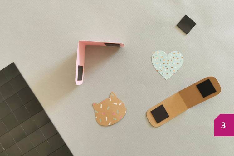 Etape 3 : Plier les languettes et apposer de part et d’autres des pastilles aimantées adhésives. Veiller à bien les coller l’un en face de l’autre.