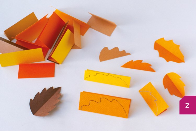 Etape 2 : Plier chaque papier en deux. Dessiner le contour des feuilles au crayon et les découper. Déplier toutes les feuilles.