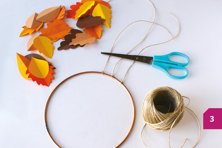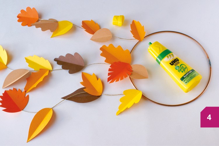Etape 3 : Nouer 3 longueurs de ficelles (deux de 20 cm et une de 30 cm). Coller les feuilles sur les fils à l’aide de la colle UHU Twist & Glue.