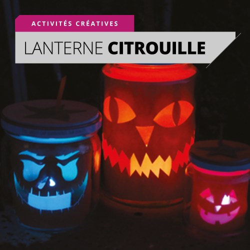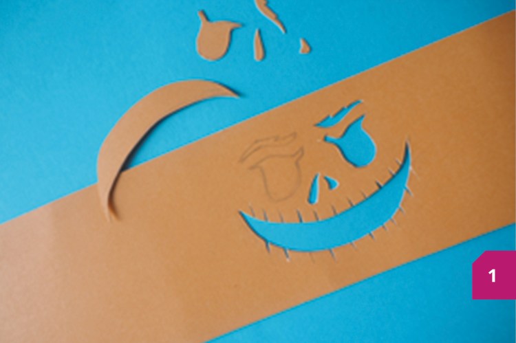 Etape 1 : Dans le papier orange, découper une bande de la hauteur de l’intérieur du pot, et assez longue pour en faire le tour. Dessiner un visage grimaçant sur le centre de la bande et évider le.
