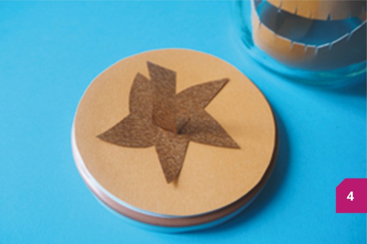 Etape 4 : Découper grossièrement dans le papier marron une étoile et coller la sur le couvercle. Découper une tige, plier son extrémité et coller ce rabat sur l’étoile. Vous n’avez plus qu’à déposer une bougie électrique dans le bocal et le refermer avec le couvercle !
