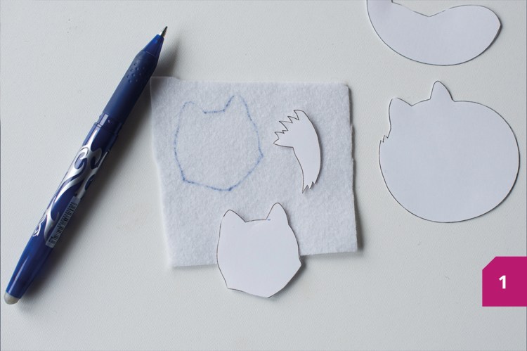 Etape 1 : Télécharger et imprimer le gabarit. Découper les différentes parties du renard. A l’aide du stylo frixion, tracer les contours de la tête et du bout de la queue sur la feutrine blanche.