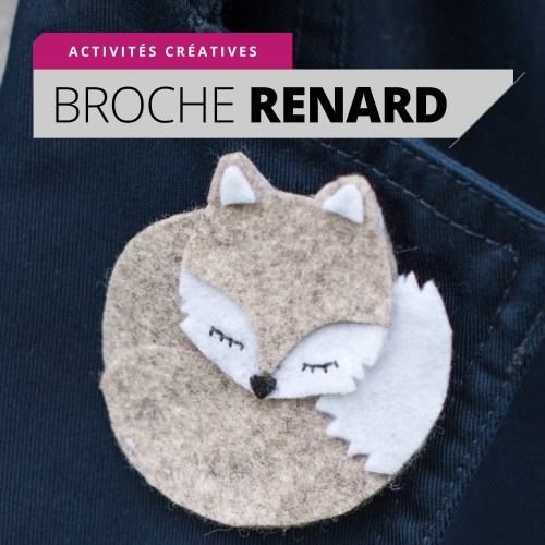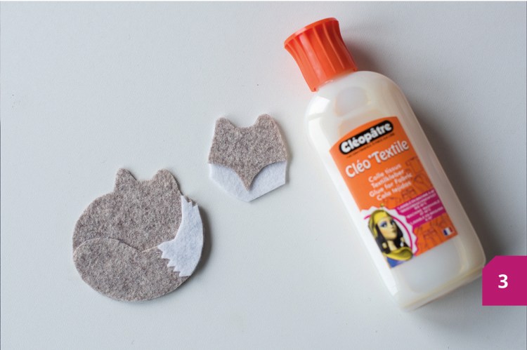 Etape 3 : Appliquer la colle textile sur le bout de la queue, puis la coller en place sur la queue. Positionner ensuite la queue sur le fond de broche. Passer à la tête. Coller la partie haute de la tête sur le fond blanc. A l’aide du fil gris foncé, broder les deux yeux du renard. Rajouter le bout du museau coupé dans la feutrine noire. Coller la tête en place avec la colle textile.
