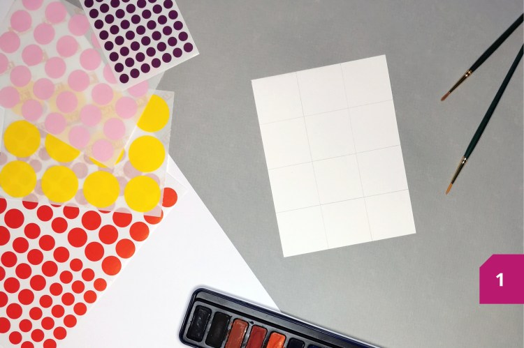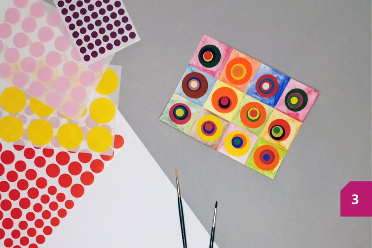 Etape 3 : Un fois sec, coller des gommettes rondes de plusieurs diamètres les unes sur les autres à l’intérieur de chaque carré.