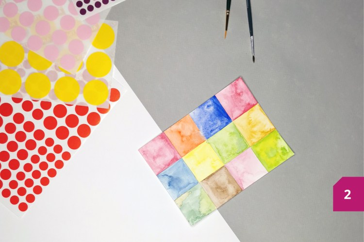 Etape 2 : Avec la palette d’aquarelle, colorer chaque carré avec une couleur différente. Laisser sécher.