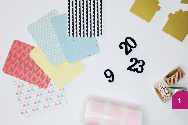 Etape 1 : Dans le papier épais décoré, découper 24 cartes de 8 x 11 cm de côté. Il est possible de réaliser des angles arrondis grâce à une perforatrice.