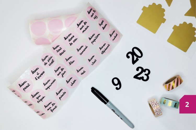 Etape 2 : Sur les gommettes rondes, inscrire 24 « bisous ». Exemples : bisou tout doux, bisou qui pique, bisou papillon, bisou pouet, bisou d’éléphant…