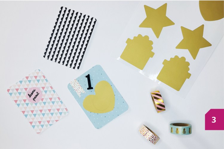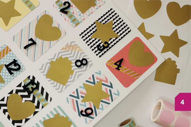 Etape 3 : Sur chaque carte, disposer la gommette ronde puis la gommette à gratter au dessus. Coller le chiffre. Enfin, décorer avec du masking tape.