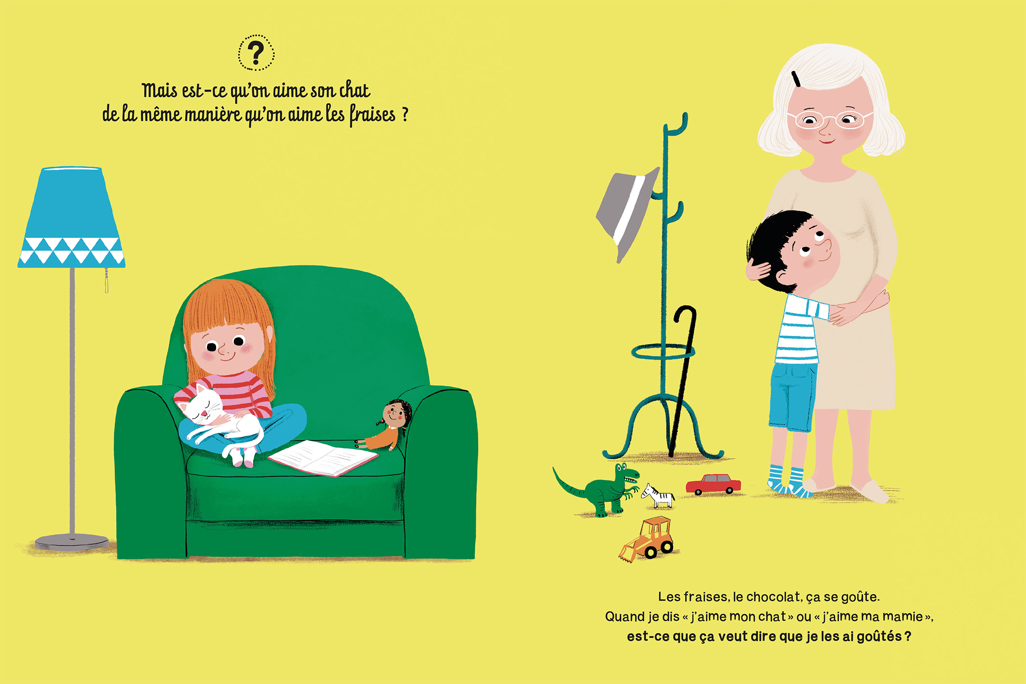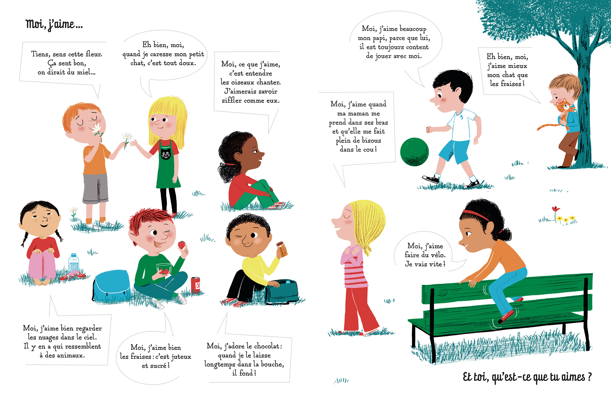 Qu’est-ce que ça veut dire « aimer » quand on peut aimer tant de choses différentes, de tant de façons différentes ? On aime avec ses sens (le chocolat, le vélo, nager…) mais aussi avec son cœur (son doudou, ses parents, ses jouets…). Par une série de questionnements, voici un livre qui aide l’enfant à prendre conscience de sa relation aux autres et à tout ce qui l’entoure. Comment vivre bien ensemble tout en développant sa propre personnalité ?