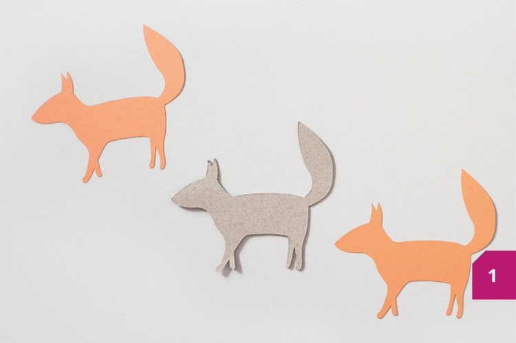 Etape 3 : Après avoir collé le corps orange au renard, coller les parties blanches pour la queue et le cou. Faire la même chose avec les autres animaux. Enfin, dessiner les yeux et le museau au feutre noir.
