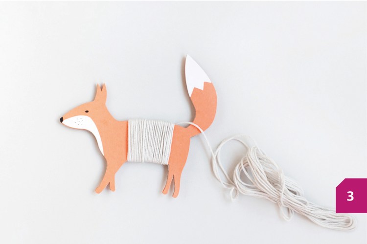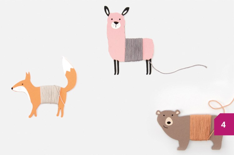 Etape 4 : Envelopper les animaux avec du fil à broder assorti. Astuce : pour débuter, coller un morceau de ruban adhésif double face entre les animaux et le fil à broder.