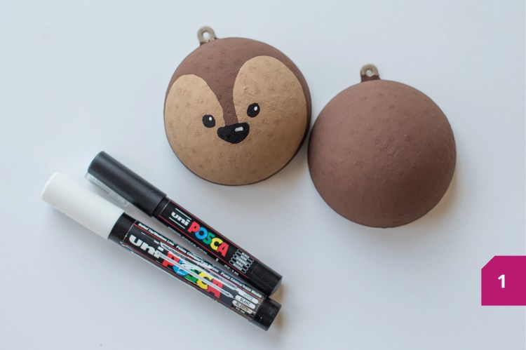 Etape 2 : Dessiner les yeux et le nez au feutre laisser sécher. Ajouter une touche de blanc pour apporter de la lumière dans les yeux du renne et sur le bout du nez.