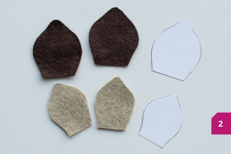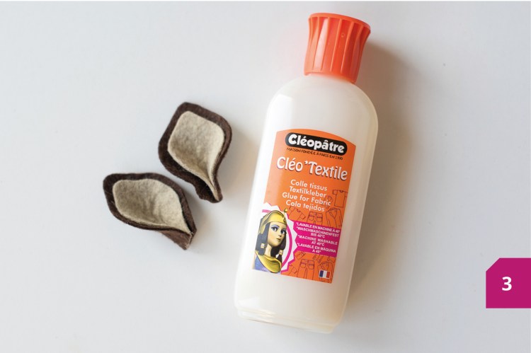 Etape 3 : Dans la feutrine marron et beige découper les oreilles. Coller l’intérieur de l’oreille sur l’extérieur avec la colle à textile. Ne pas mettre trop de colle pour que celle-ci ne traverse pas la feutrine. Laisser sécher.