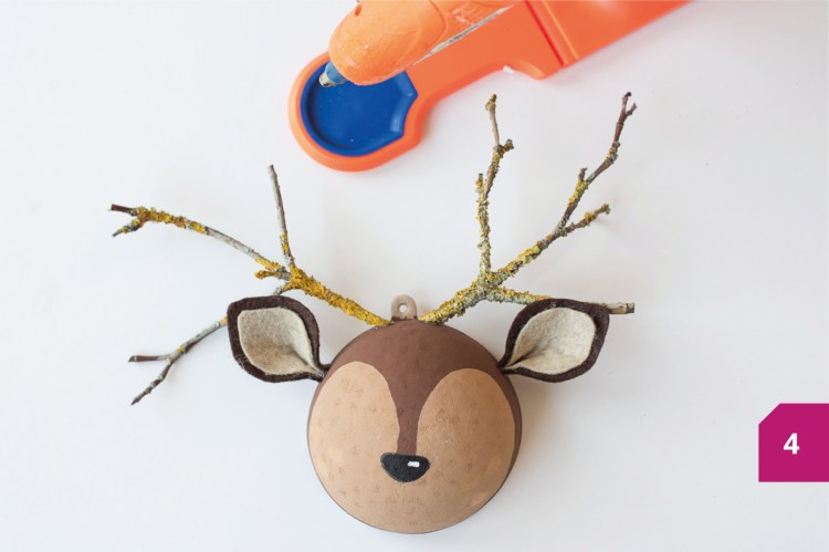 Etape 4 : Mettre une pointe de colle dans le bas de l’oreille puis pincer la base pour lui donner du volume. Au besoin mettre une pince à linge le temps que la colle sèche. Coller les oreilles et les bois au pistolet à colle et voilà le renne est terminé.