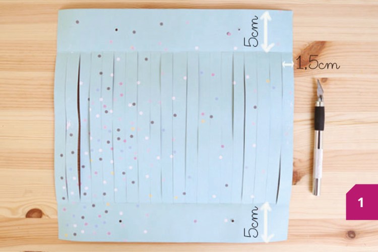 Etape 1 : Faire plusieurs fentes verticales à l’intérieur du papier de 1,5cm de large en gardant une bande de 5 cm non découpée en haut et en bas. Enrouler le papier comme un tube et l’attacher avec des trombones.