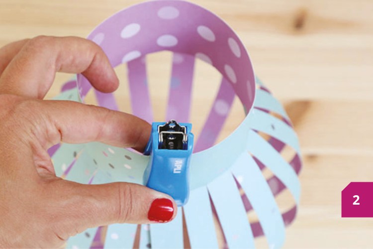 Etape 2 : Agrafer et retirer les trombones. Avec la paume de la main, l’aplatir un peu pour donner forme à la lanterne. Avec le doigt, marquer les deux extrémités des bandes pour avoir une forme ronde.