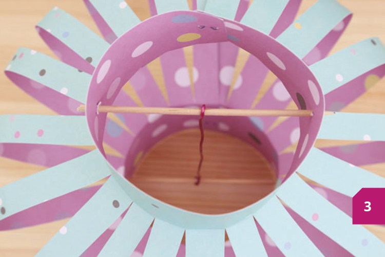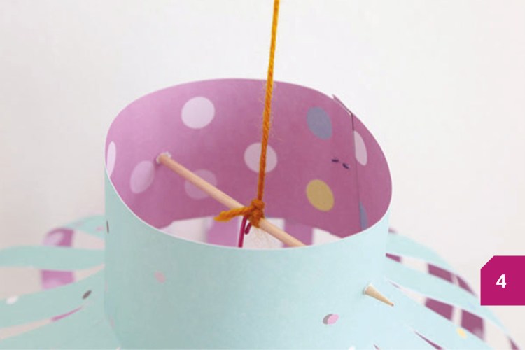 Etape 3 : Prendre les pics en bois et les introduire de part et d’autre sur la partie haute et basse de la lanterne. Avant, faire deux petits trous avec le cutter. Joindre par le centre les deux pics en bois avec du fil. Le fil fait une pression pour que la lanterne garde cette forme incurvée.