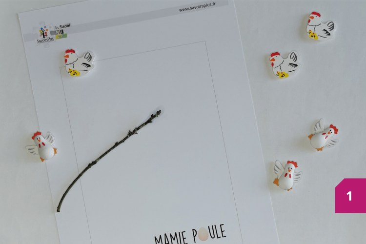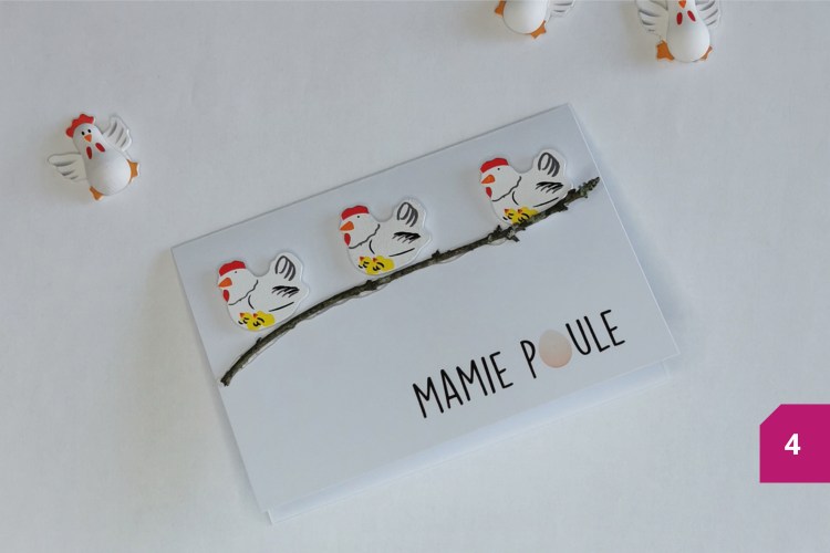 Etape 4 : Coller les décorations en bois en forme de poules au dessus de la branche.
