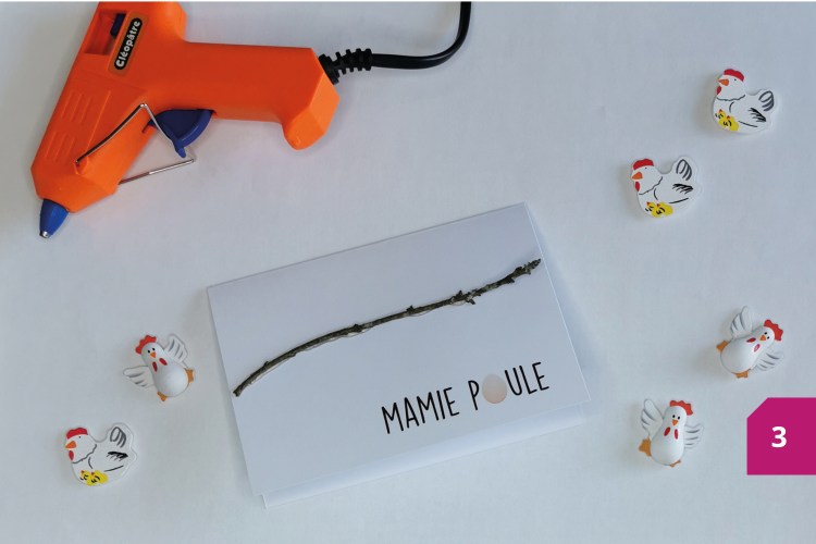 Etape 3 : Grâce au pistolet à colle, fixer la petite branche sur la carte, à peu près au centre de la page.