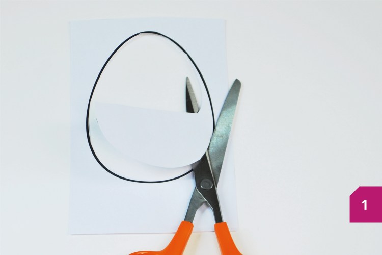 Etape 1 : Télécharger et imprimer le gabarit. Découper la carte (10 x 15 cm) et évider la partie centrale de l’œuf. Dans le papier blanc à dessin, découper également une carte de 10 x 15 cm.