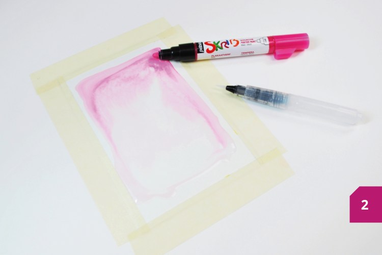 Etape 2 : Sur le plan de travail, fixer la carte à l’aide de masking tape. Humidifier légèrement le papier à l’aide du pinceau à réserve. Dessiner avec les feutres Skrib. Plus on reste au même endroit en appuyant, plus la couleur est forte et inversement.