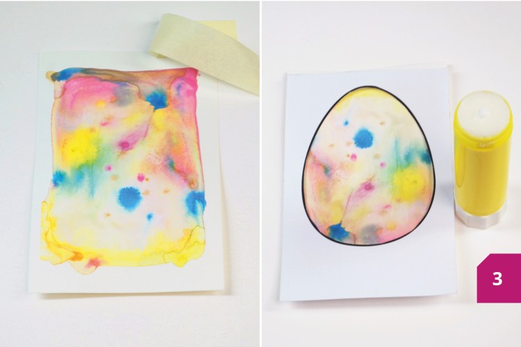 Etape 3 : Laisser sécher. Lorsque le dessin est complètement sec, retirer les masking tape. Coller la carte évidée sur la carte peinte.