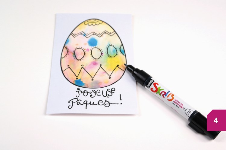Etape 4 : Avec un feutre noir, dessiner des motifs sur l’œuf. Repasser le contour de l’œuf en noir. Ecrire Joyeuses Pâques !