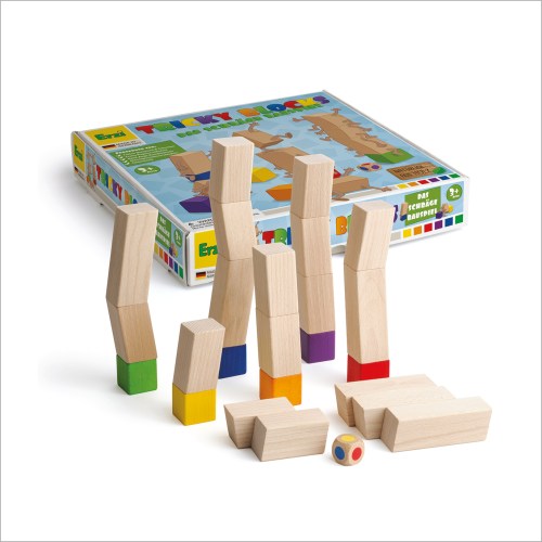 6 blocs colorés qui formeront chacun la première pierre de 6 tours qui devront être construites de plus en plus haut. Attention car les blocs de construction qui devront être placés dessus sont tous tordus et un mauvais mouvement pourrait tout faire s’écrouler.