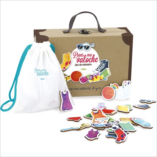 Le jeu de mémorisation oral que tout le monde connait : «Dans ma valise, j’ai mis…». Chaque joueur pioche une pièce en bois dans le sac en coton et la cache dans la valoche en indiquant ce qu’il vient